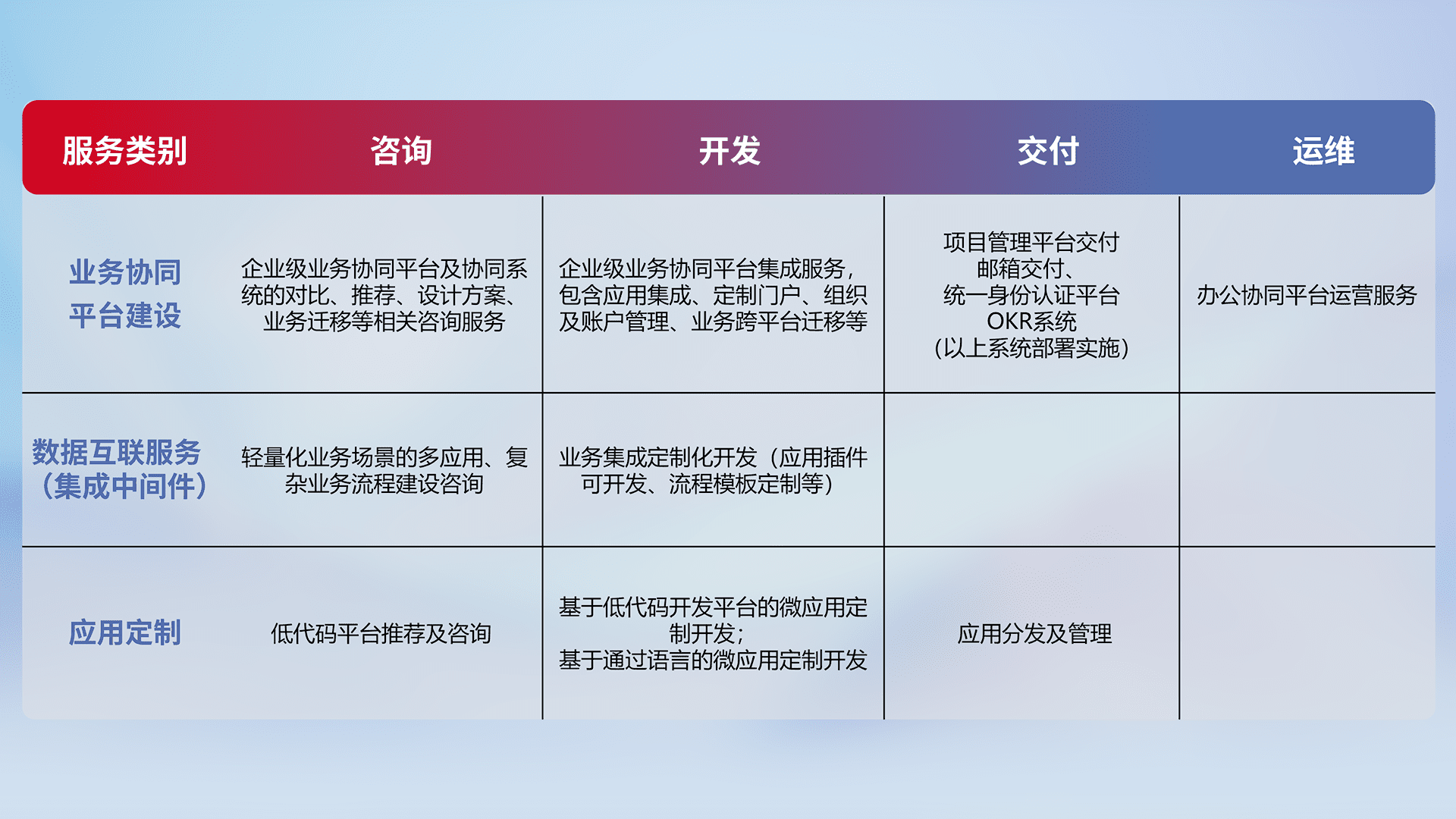 针对钉钉、、、、企微、、IDaas等平台级产品提供产品的规划、、方案、、交付、、、定制化开发等服务,,,实现如统一协同办公、、、、智能客户服务、、、、混合会议管理、、、智能数据查询、、、、等业务场景,,实现数字化转型。。