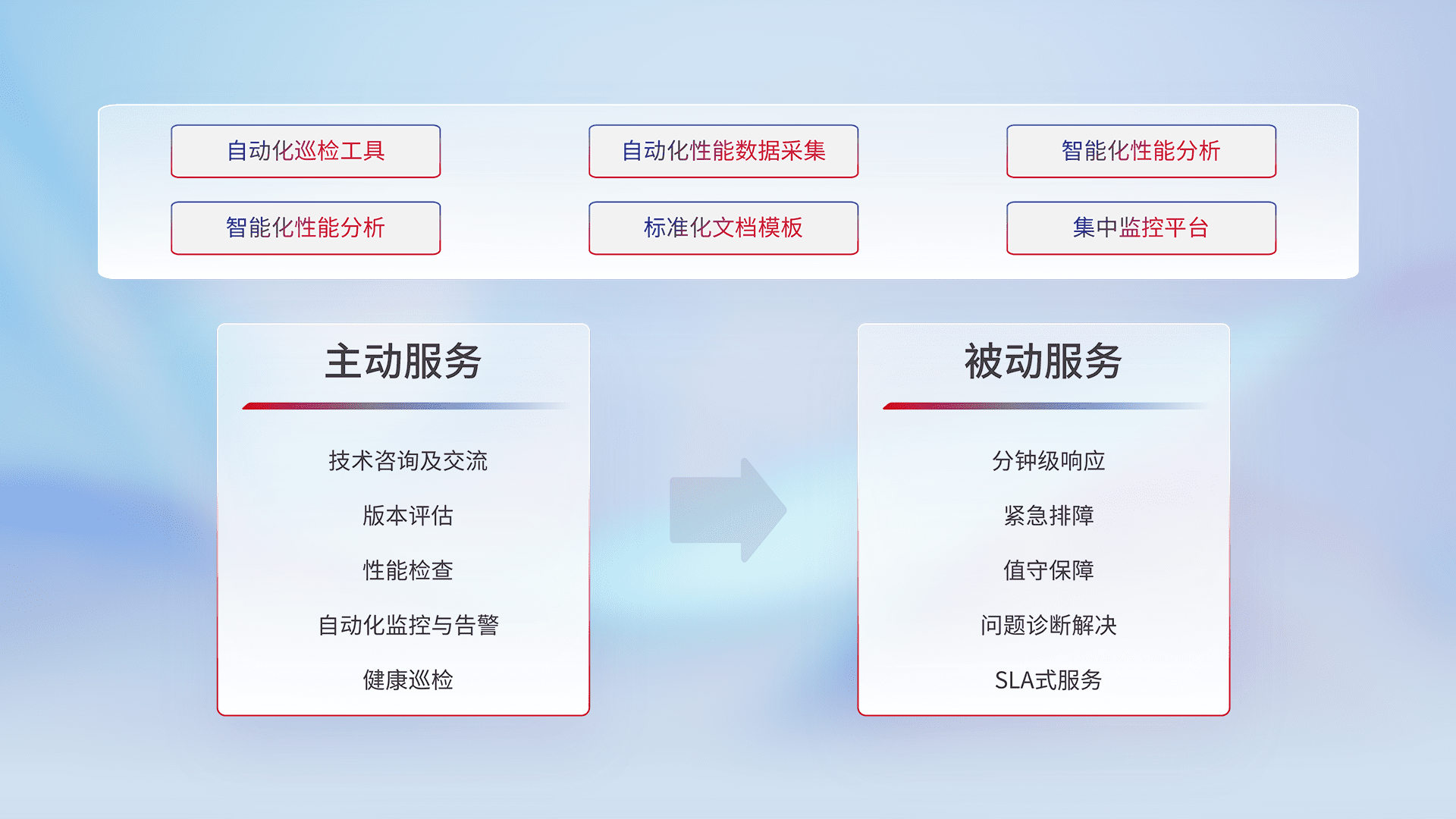 智能化工具和标准化文档,,,,保障服务质量,,提供主动服务(包含技术咨询、、、版本评估、、、性能检查、、自动化监控与告警、、、、健康巡检)和被动服务包含(分钟级响应、、紧急排障、、、值守保障、、、、问题诊断解决、、、、SLA服务)。。。。